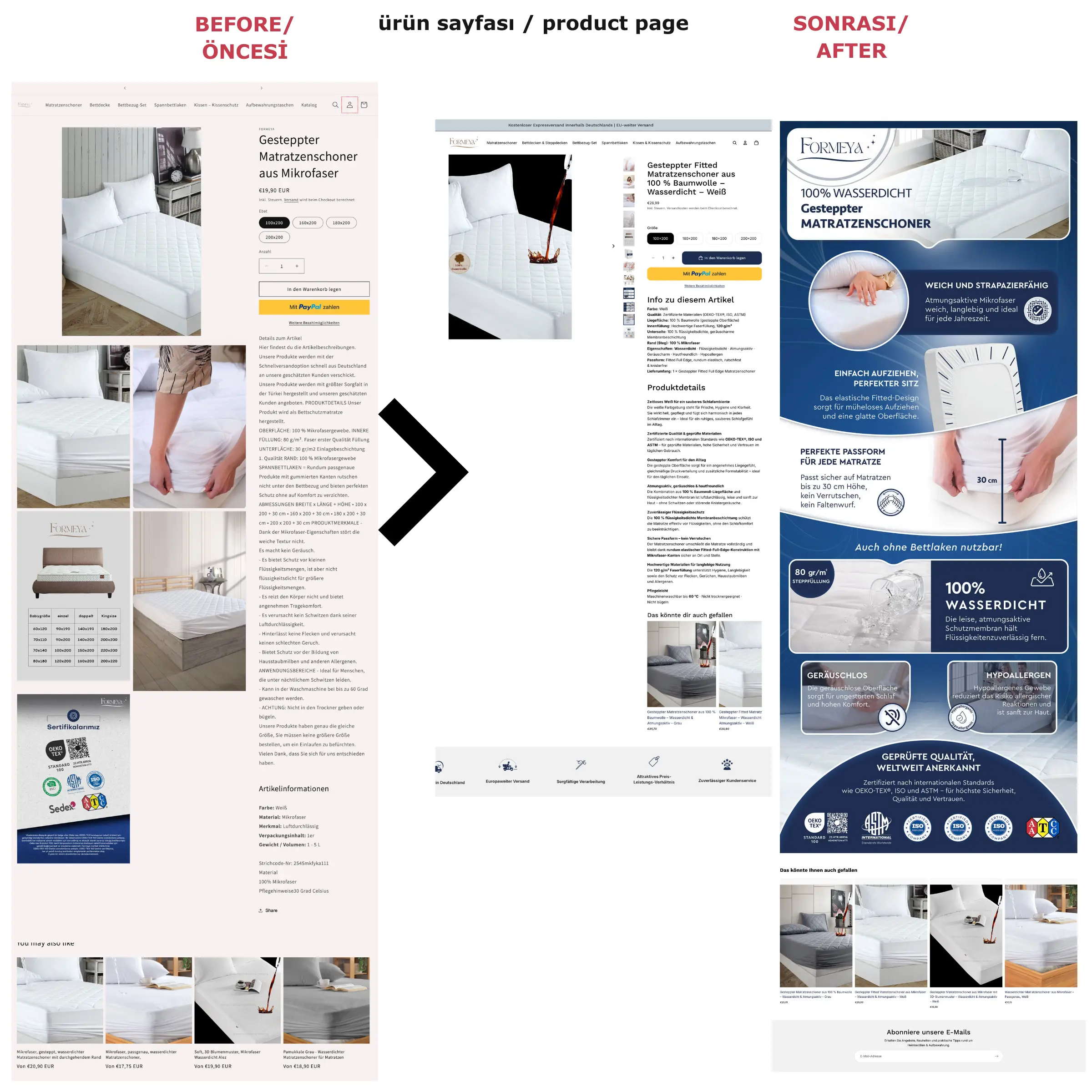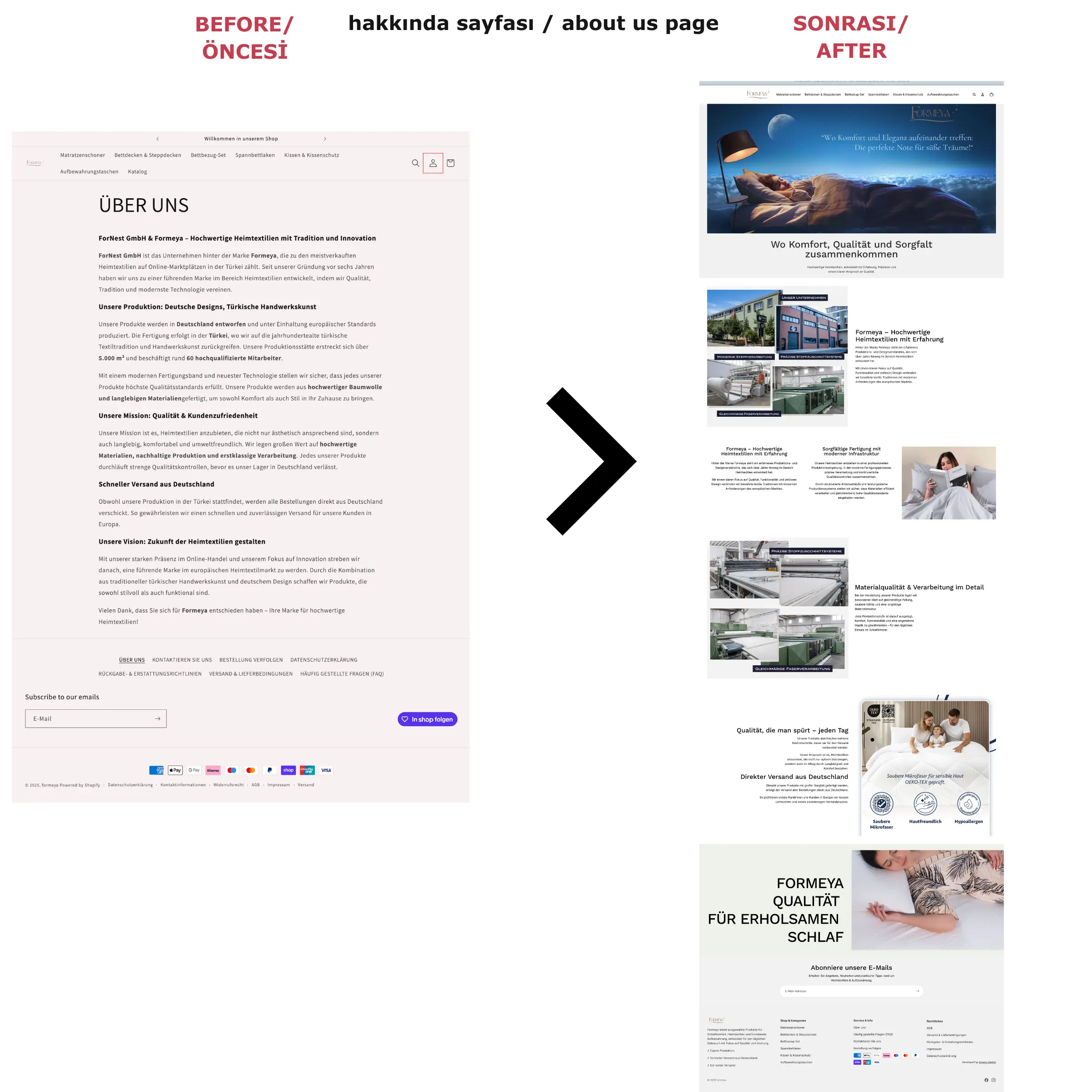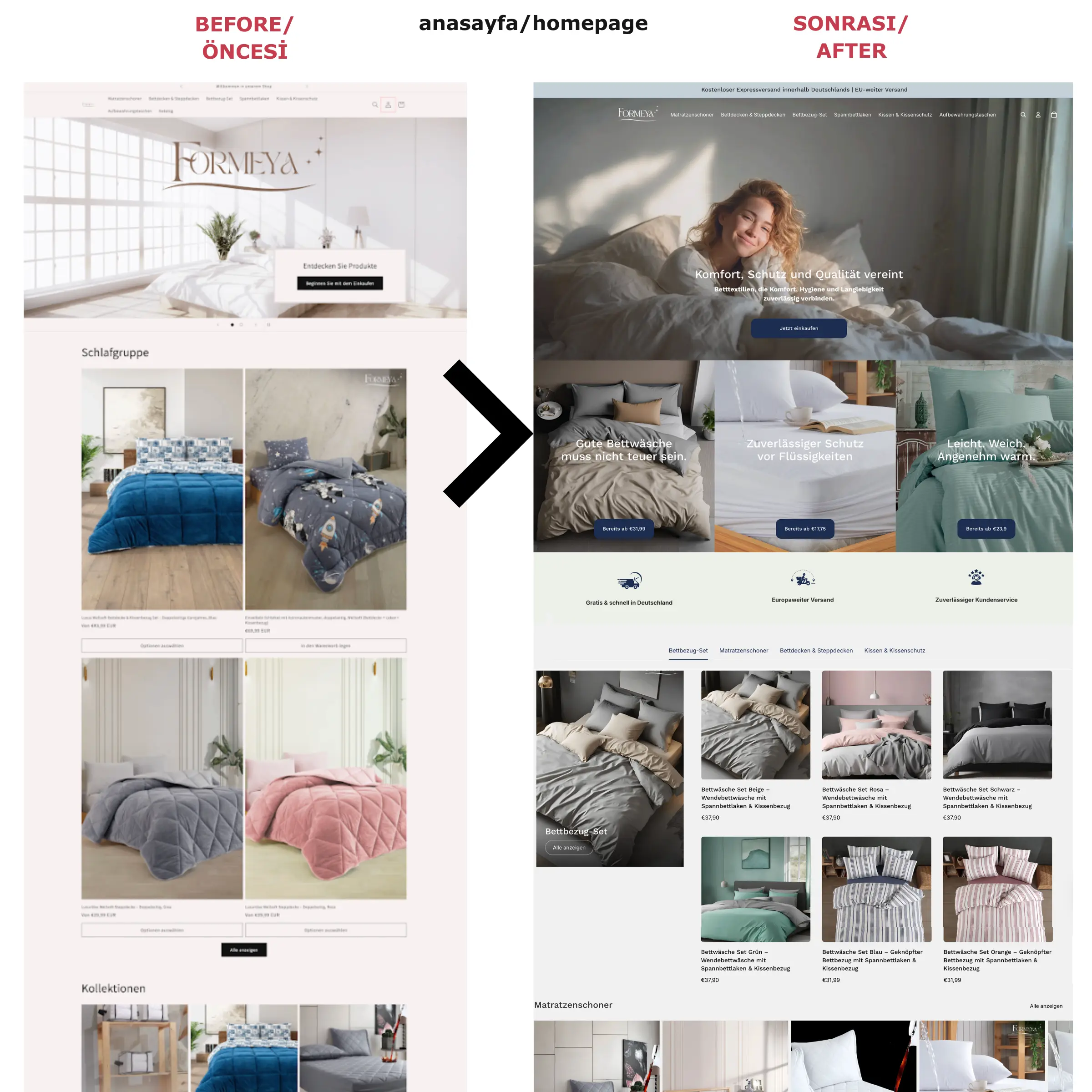 Formeya.de, Almanya merkezli bir ev tekstili markası için kapsamlı dijital dönüşüm projesi. Marka kimliği standartlaşması, Shopify altyapısı üzerinde tam web geliştirme, ürün optimizasyonu, SEO stratejisi ve Almanya e-ticaret mevzuatına uyumluluk birlikte ele alındı.